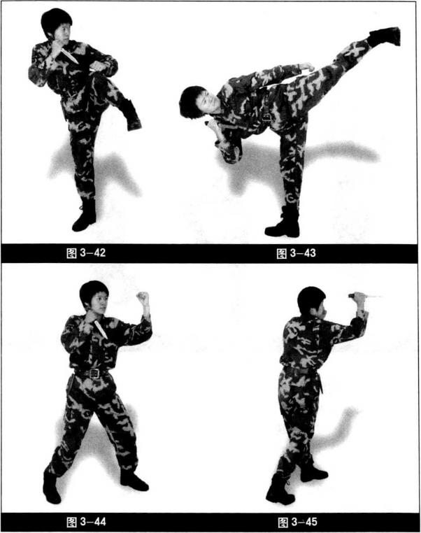 右脚脚掌向外拧转腿微屈左腿屈膝收腿左臂收至腿外侧右手位置不变(图3-42)。左腿大腿带动小腿膝关节挺直向前上方直线踹出身体与腿成一条直线力达脚跟。左拳自然下摆至大腿外侧目视攻击方向(图3-43)。左腿收腿落步左手握拳横格挡(图3-44)。右手匕首由下至上挑刺刀尖朝前身体左转右脚跟步脚跟略起左拳护腮。目视前方(图3—45)。