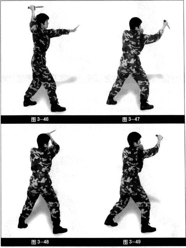 由右至左发力两腿微屈(图3-47)。重心不变右手收至头前上方同时右脚向前上小半步(图3-48)。匕首由上至前斜扎