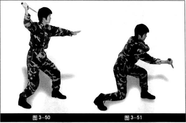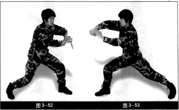 颈部同时左脚向前跟小半步由左至右发力两腿微屈(图3-49)。左脚向前上步两臂前后拉开刀尖朝前(图3-50)。匕首由右向里横刺同时重心下潜成麒龙步后脚跟微抬起刀尖朝斜下左掌立于右大臂上目视攻击方向(图3-51)。