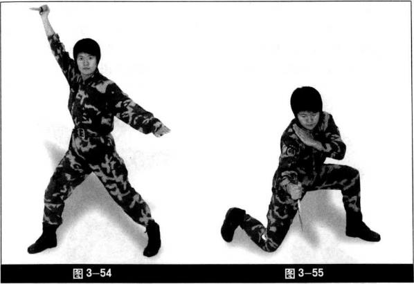成跪步匕首向下快速扎刺刀尖朝下力达刀尖。左手立掌至右肩内根心目视攻击方向(图3-55)。