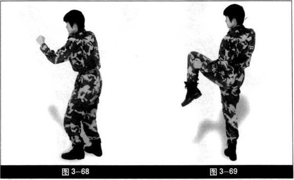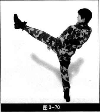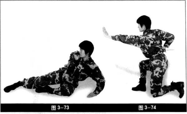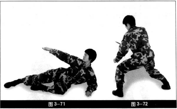 右脚前垫步右手收至下颌(图3-68),左腿屈膝上抬脚尖绷紧左拳自然下摆至左腿外侧右手位置不变(图3-69。)左腿由弯到直向前上方弹击力达脚背(图3—70),左腿收回落地重心向下坐,两腿微屈右手收至胸前(图3-71)身体右后转体两腿下蹲匕首收于胸前身体向左侧倒右腿向右扫半圈力达脚跟左腿收腿左臂弯曲,小臂于大腿外侧臀部同时着地右手匕首向右前方横斩,目视攻击方向(图3—72)。11 撑臂收腿跪步推拿左臂撑起右手换正握匕首收于腰间(图3-73)。右腿收腿成跪步左手向前推掌(图3—74)。