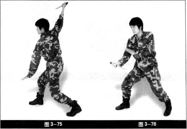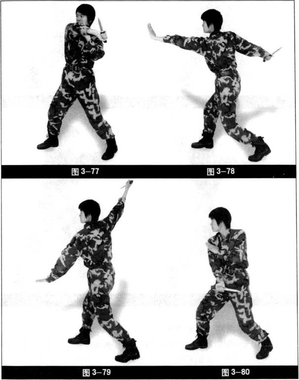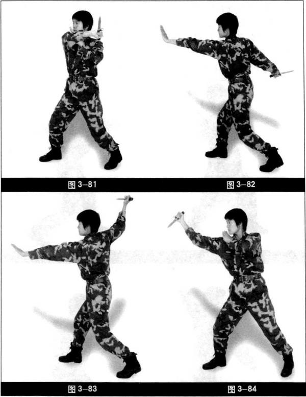 右脚向前上小半步左脚跟步两腿微屈。两手拉开右手至头上方刀尖朝前左手立掌于身体左侧目视前方(图3-75)。身体左转匕首由右上至左下划刀尖朝后左掌立于右臂内侧(图3-76)。右臂抬至左肩上方刀尖转向斜上方左手位置不变(图3-77)。身体右转匕首由左上方至右后下划刀尖朝后左掌向正前方推出(图3-78),而后动作重复一遍(图3-79?图3-82)。右脚向前上小半步右手匕首抬至头上方刀尖朝前(图3-83)。身体左转匕首由后向前上方下刺身体左转左掌至右大臂内侧左脚向前跟小半步(图3-84)。