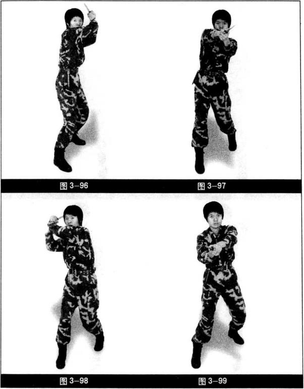 右脚向前上半步双手抓握匕首抬至头上方刀尖朝斜后方(图3-96)。右脚向前跟步匕首由左向前上方斜砍(图3-97)。两手收回至身体右侧身体稍向右转刀尖朝后(图3-98),匕首由右向前上方斜砍重心坐于中间身体稍左转目视前方(图3-99)。