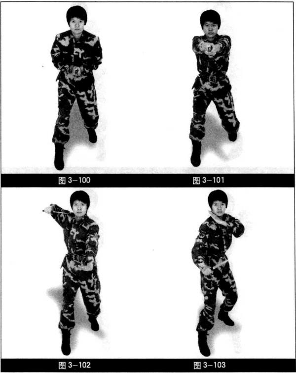 右脚向前上半步两手收回腹前目视匕首(图3-100),左脚跟半步,两手向前方直线刺出目视前方(图3-101)。右脚向前上半步身体直立,右手收回右肩前刀尖朝斜前方左手向前推掌(图3-102)。左脚跟步,脚跟微起右手向前下方下压力达刀刃左掌防守于下颌目视攻击方向(图3—103)。