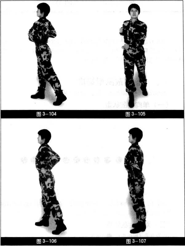 身体立直右转右脚向右前方上步左脚跟提起两膝挺直左手扶于刀鞘匕首放于刀鞘内(图3-104、图3-105)。两手握拳至两侧拳心向内(图3-106),并步靠脚成立正姿势(图3-107)。