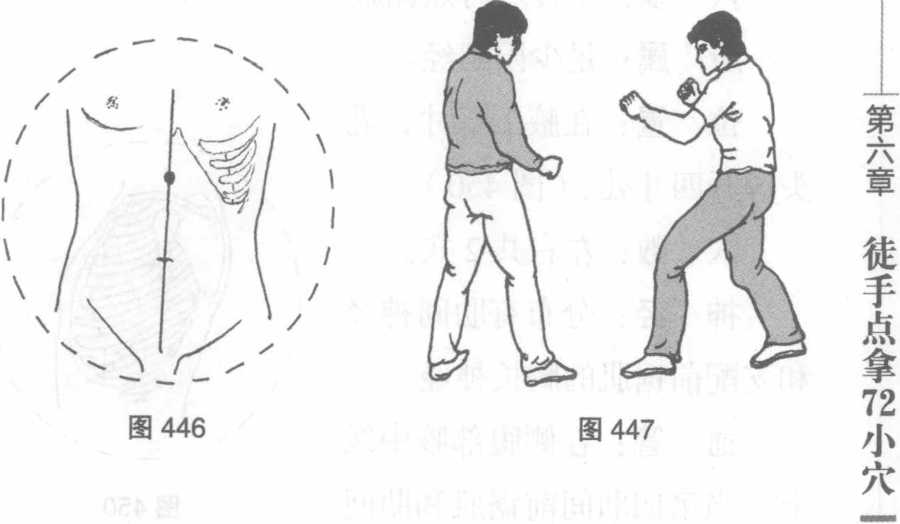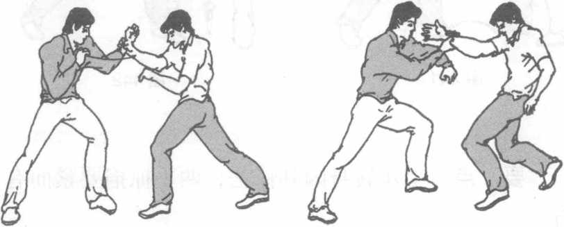 点击对方左格斗姿势站立我右脚在前左脚在后站立(图447)。对方右脚向前上步用右手勾拉我颈部左手抓住我右手腕企图摔倒我时(图448),我右手立即向右摆动同时左手变椎指手形,向前点击对方上魔穴(图449)