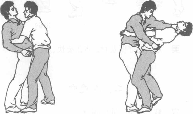 徒手徒手图101 图102图101 图102点拿当对方从前用双臂将我腰部抱住企图摔倒我时(图101)我立即用右臂抱住对方腰部向回搬拉同时左手变鹰爪手形扣掐对方颈两侧的人迎穴并向外推出(图102)。图101 图102图101 图102要点拉、推要形成反向之力使对方向后失去重心掐穴时力达指尖。