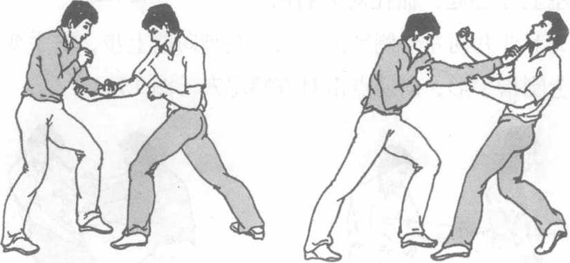 点击对方左脚向前上步用右勾拳向我腹部攻击时我身体后移用左前臂向下压防(图150)。随即左拳变金刚指手形向前上方伸出点击对方上廉泉穴(图151)