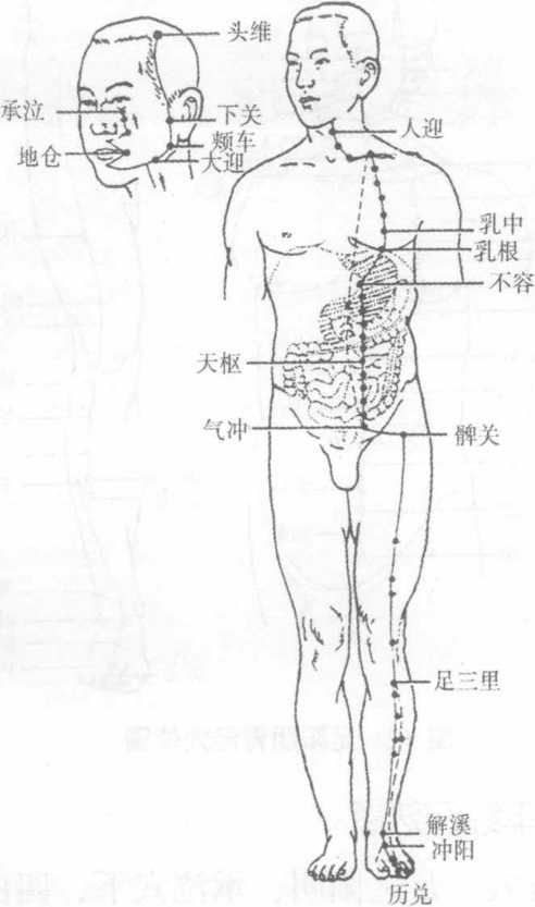 承泣穴下四白巨修下关头维通于发边水突气舍缺盆连接行人膺窗乳中乳根关门太乙滑肉天枢水道归来气冲下外
