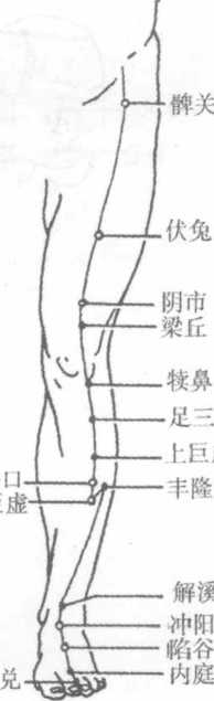 又穴髀关大腿之前伏兔在间阴市梁丘犊鼻歌缘入足三里巨虚条口入下巨虚丰隆微起下到解溪冲阳溪下陷谷内庭,厉兑穴终。