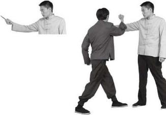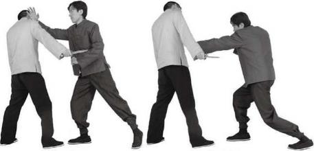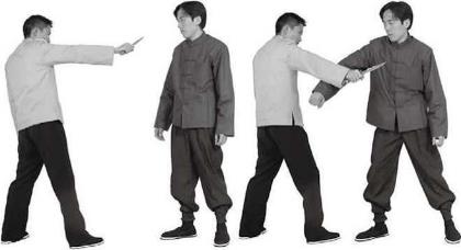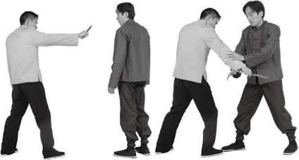 图568 图569图568 图569(图568),甲看准乙动向疾向前上右脚右手在下左手在上向前挡住乙右手(图568),甲看准乙动向疾向前上右脚右手在下左手在上向前挡住乙右手图570图570图571图571甲与乙对峙时乙用右手反握匕首向正前上右脚由其右肩外侧向甲颈喉或胸部横割出