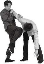 手臂由乙右臂上穿过圈住乙右肘臂处右手顺势抓住乙右手腕(图562),乙欲反抗甲左小臂用力下压乙右大臂左手同时下扒按乙右肘关节处右腿屈膝上抬猛顶击乙头或面部(图563)