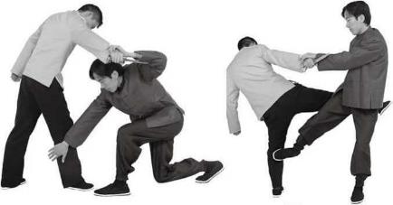 腕(图569),随即两腿屈膝下蹲下滑右手反手抄起乙右小腿踝处(图570),未等乙反应甲动作不停将乙右腿抄起上抬乘机发出右脚侧踹乙支撑左腿膝关节里侧左手配合拉乙右手腕将其踹跌倒地(图571)。