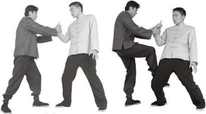 (图610),乙被迫屈膝向后仰身瞬间甲起右脚猛踩踏乙右腿膝关节处(图611)