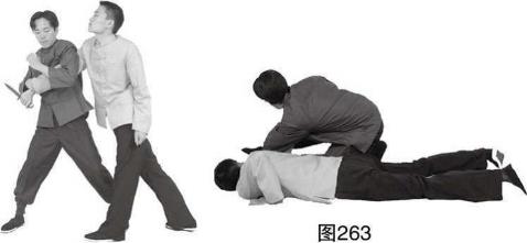 图262图262接近乙疾用双手交叉封架住乙右手前臂处(图261),随即顺势用右手抢抓住乙右手腕并用力反拧左臂配合夹压住乙右上臂(图262),同时撤右脚身体猛向右后压别乙右肩处迫使乙肩部受挫松脱凶器摔趴倒地(图263)