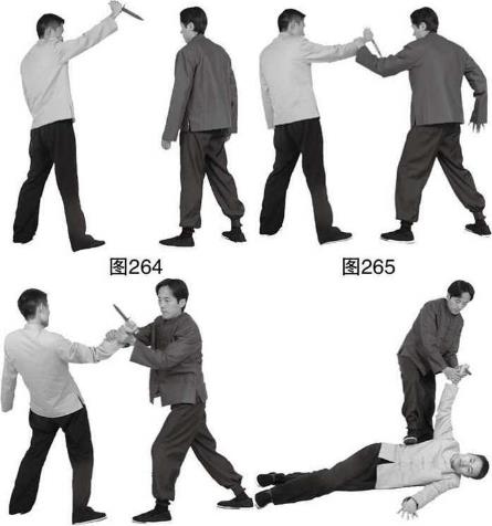 图270 图271图270 图271(图268),甲迅速向右前上右脚成右闪身状在乙刺出右臂下滑时甲随即用右臂由上向下压挡乙右小臂(图269),紧接未等乙反应甲右臂屈肘变式向上突顶击乙颈喉处(图270),乙被击仰头瞬间甲顺势起右腿用膝顶击乙下裆部迫使乙上下遭击松脱匕首后退(图271)