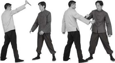 图260 图261图260 图261甲与乙对峙时乙用右手正握匕首由其上方向甲头部或肩部刺击(图260),甲上左脚