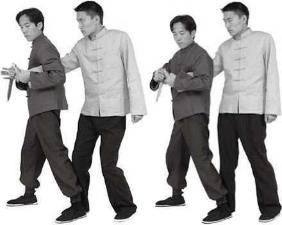 迅速向左侧前上左脚同时右闪身左手由外挡抓住乙右手腕