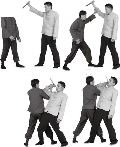 甲与乙对峙时甲用右手正握匕首上右脚由其右肩上方向甲头或肩部刺杀(图272),甲看准乙动势,