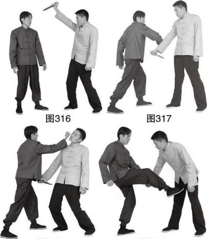 捶头弹裆小动作甲与乙对峙时乙用右手正握匕首从正前面上右脚由其左肩斜上方向甲头或肩部刺(图316),甲迅速向左侧上左脚左闪身避开乙刺杀同时右臂上抬右小臂顺势随乙刺的方向压其右小臂(图317),紧跟左手抓握乙右手腕右手握拳以拳背猛捶击乙头部右侧或面门(图318),乙被击仰头瞬间甲动作不停起右脚突弹踢乙裆部图318 图319图318 图319(图319)图318 图319图318 图319暂说明看准凶器刺杀的方向、时机压臂及时、顺势抓腕快、准、紧捶头弹裆突然、凶狠。作用用于夺取正握匕首左斜刺头、肩部。
