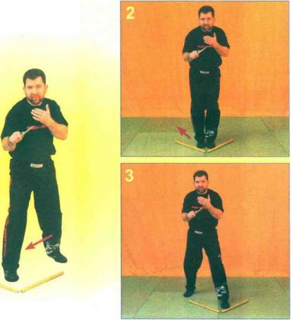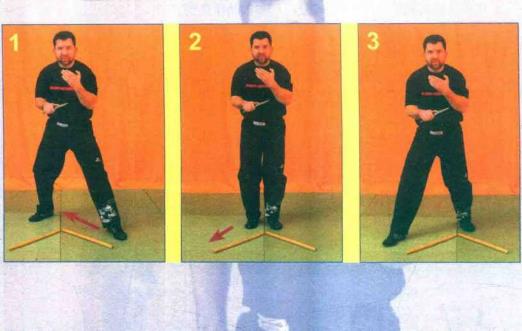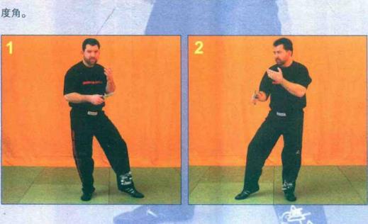 男性三角站姿夹角指向攻击者。身体的重心落在前脚或后脚均可。要将右腿在前的站姿转变成左腿在前的站姿时后腿前迈前腿后收即可。