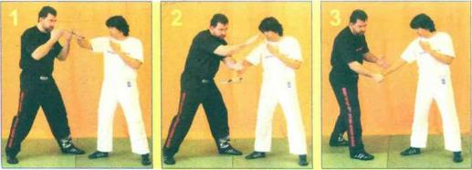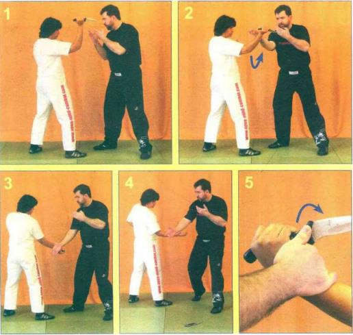 自卫者使用上述旋转动作击落攻击者的武器注意用拇指对刀背施压。