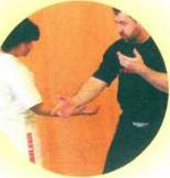 自卫者将左手置于攻击者右手附近使双方小指相互接触。