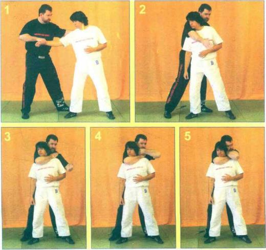 3 自卫者继续用右手向前拉攻击者的手臂并将身体移至攻击者的身后。