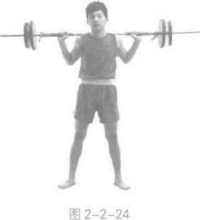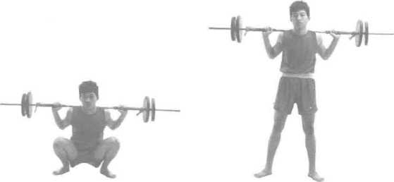 1 负重深蹲肩负杠铃或人两脚开立与肩同宽做深蹲起立动作反复练习。要求挺胸、塌腰下蹲慢起立快(图