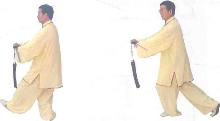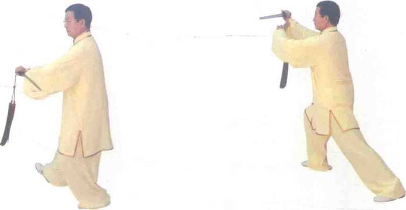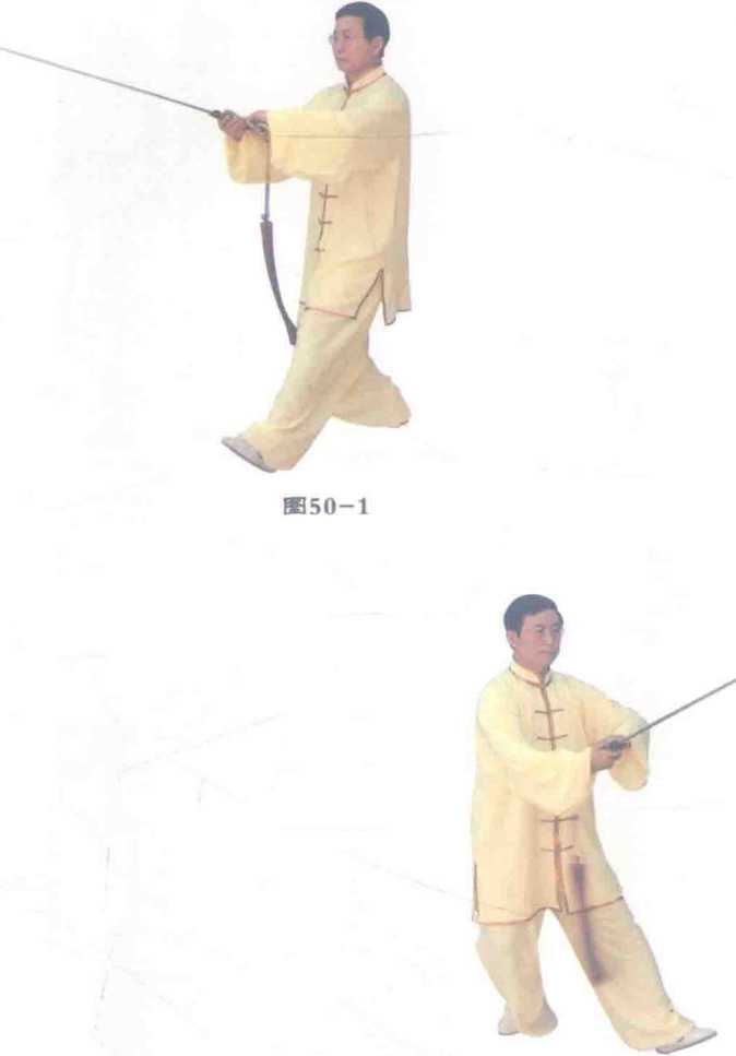 1. 盖步横剑 goi bu heng Jian (图50-2 )2. 转体横剑 zhuan ti heng jian (图50-3 )3. 迈步平扫 mai bu ping sao (图50-4 )4. 弓步拦剑 gong bu Ian jian (图50-5 )图 50-2 30 5 0 -3图 50 - 4 圈 50-5