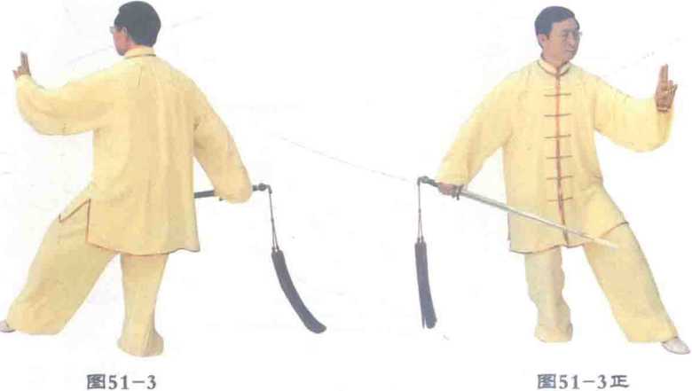 教学口令:1. 跟步点剑 gen bu dian Jian (图51-1 )2. 转体抽剑 zhuan ti chou jian (图51 -2 )3. 虚步藏剑 xu bu cang jian (图51-3.图51-3正)教学口令:图 52—3