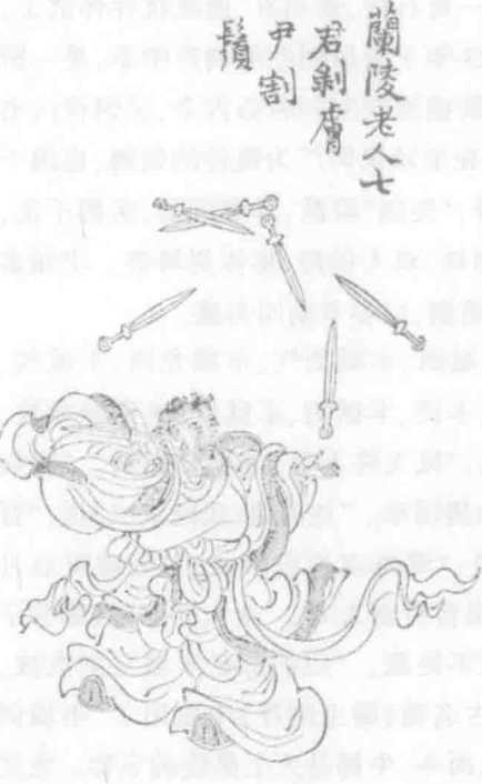 (兰陵老人)紫衣朱囊,盛长剑七口,舞于中庭,迭跃挥霍,批光电激,或横 若掣帛,旋若欲火。有短剑二尺余,时时及黎之衽。黎叩头股栗。食顷,掷剑于地, 如北斗状。