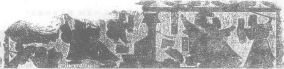 神毕现的效果,同时更能不失装饰性的壁雕要求,其手法之高明,令人赞叹。高 校古代文学教材中《荆轲刺秦王》的插图就是取自此处。这一精彩的画像还出现 在中国邮票上,中国邮政发行的1999-2《汉画像石》特种邮票一套.共6枚,其中 6-5就是《荆轲刺秦王》。