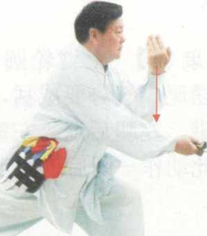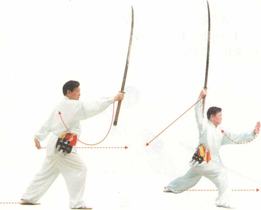 【动作要领】 上臂轮圆,肩要活,动作要一气呵 成,像猛虎摆尾,气势要威猛,定势成低弓步。刀尖上举 时应用力上戳。左腿后退、左掌前伸,刀、腿、手、眼要 四点齐到(此动作一同后退四步)。