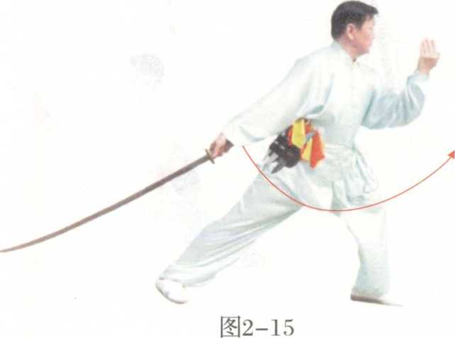 右腿再向后退一步,左腿再退后一步,屈膝成右弓 步;当刀抡劈到刀尖向下时,刀尖上抬,右臂直举上刺, 刀刃向前方。(图2-13)