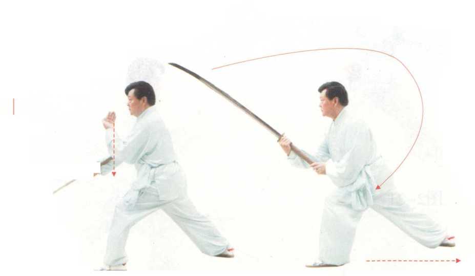 【动作要领】身体向右旋转时,两腿拧转成右歇 步。刀要贴住身体,刀随身转,不留间隙。