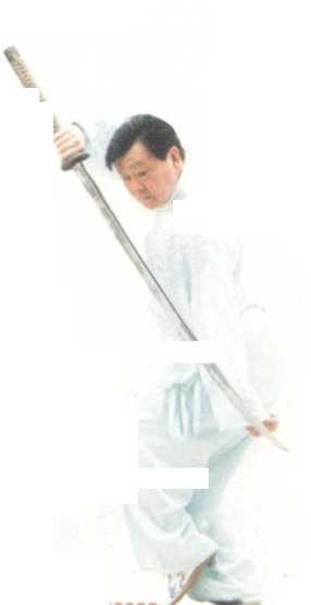 【动作要领】右手握刀柄为支点,左手向下按压刀 转。向上挑刀时,力要猛。另外,刀自下向上挑时,刀要 紧贴身体和右腿一起动作,一起到位,犹如青龙从大海出 水一般,急速挑刀。