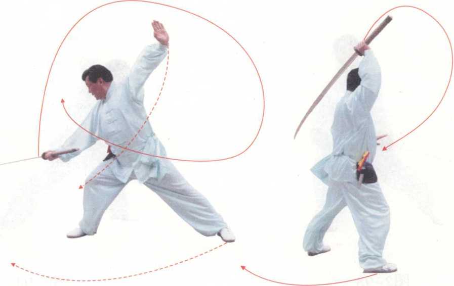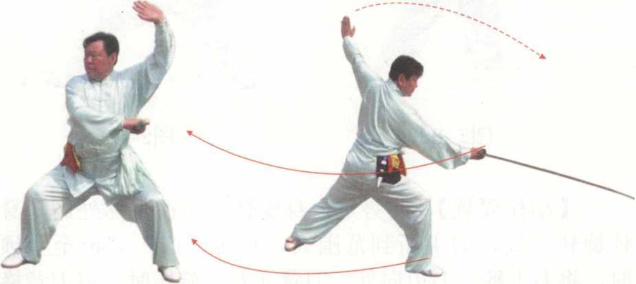 【动作要领】旋转时是用趟泥步,两脚离地不能太 高。动作要轻快,速度要快,左手在头顶亮掌,右手平行 持刀。右旋两周。犹如鹦子盘云一般。