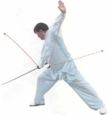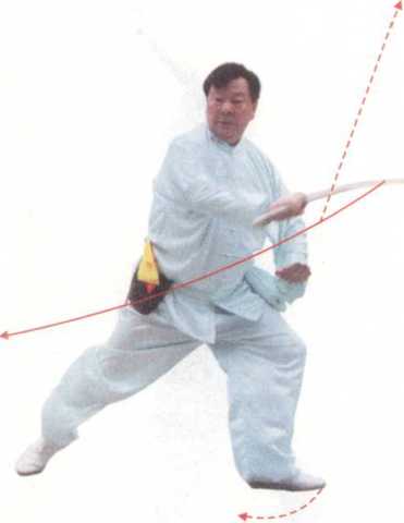 【动作要领】此势弓步、亮苗刀、飞小刀要同步, 协调一致。三个动作同时完成。