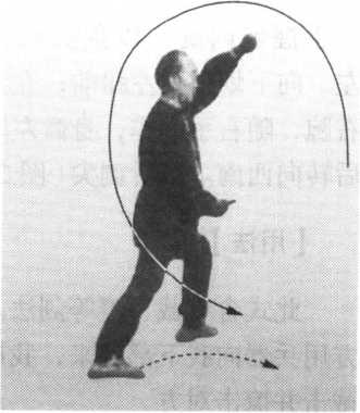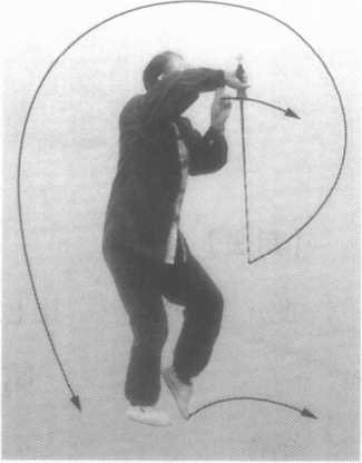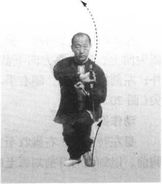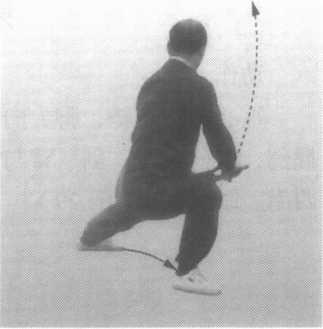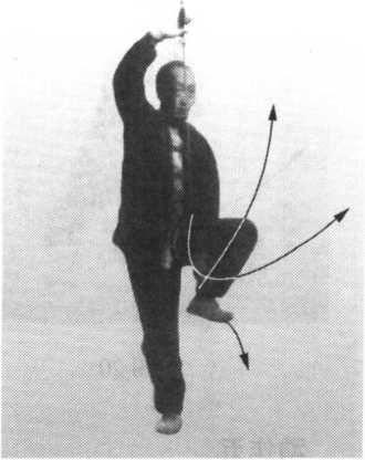 身上长;左膝提起,脚掌与地面平 行;同时,右手握剑,外旋180°,上提 至头右上方;左剑指向下划弧至左膝内 侧,剑指向南。眼向东看去(图24)。
