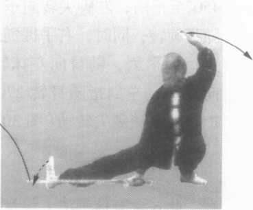 身左转向东北;右脚向东南方向踏 一步,脚尖向东偏南,成右弓蹬步;右 手握剑,稍内旋,随身向前,以剑尖向 左、向下、向身左后侧划弧至左脚前; 左剑指向左、向后、向前划弧至腹护右 腕。眼看剑尖转动(图26)。