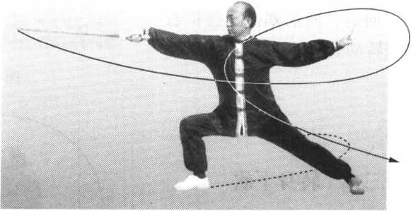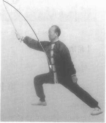 此式含有刺剑法。接上式,对方后退,我以剑追刺对方。
