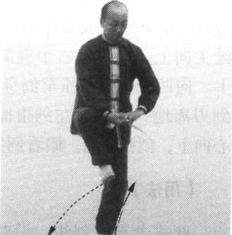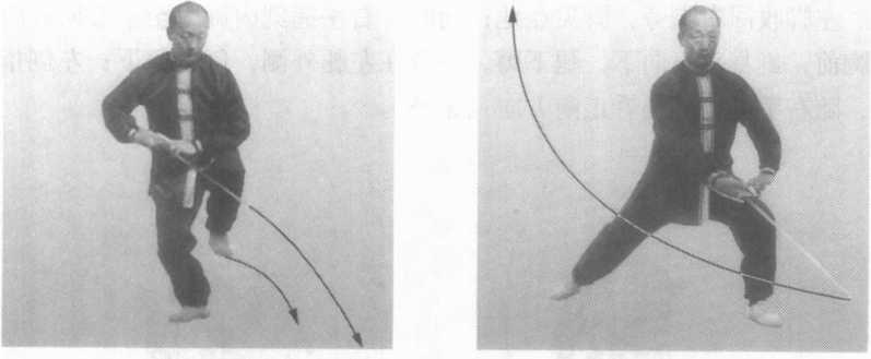 此式含有剌剑法。设对方以兵器向我 下部刺来,我跳步避过,以剑刺对方手腕。