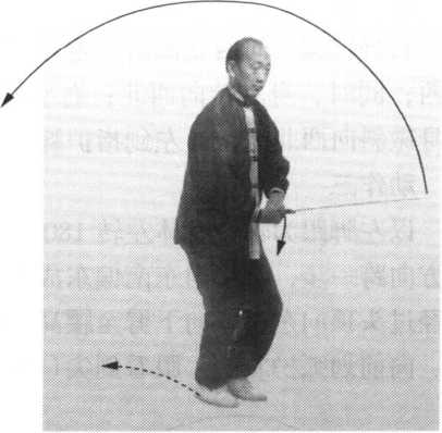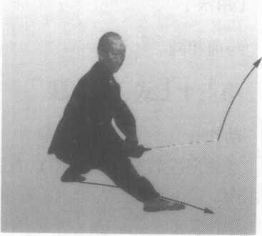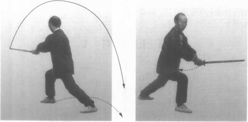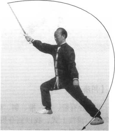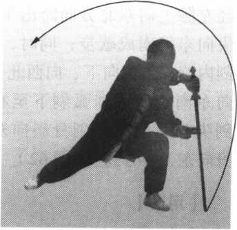 左脚变实,身向右转至西南; 右脚向西北方向踏一步,脚尖向 西北偏西;左脚尖转向西南偏西 成右弓蹬步;同时,右手握剑, 以身带剑向西北上方挥去;左剑 指下按至左腿外侧。眼看剑尖 (图 70 )。