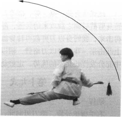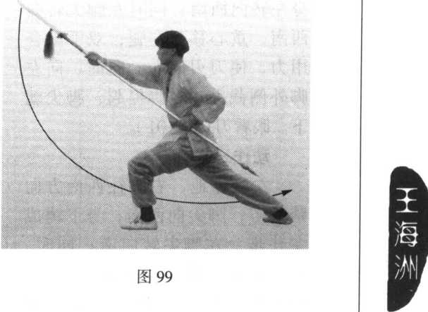 身上长;左脚尖转向西偏 北;右脚尖转向北偏西;同时 重心移到左脚,双手配合用 力,使刀向西北方向砍去,刀 与头同高。眼向西北方向看去 (图 99 )。