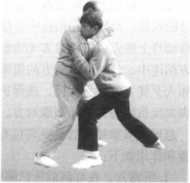 乙方紧贴甲方,从中部要将甲 方推出或发劲击打甲方,甲方右手 伸至乙方脑后,以手掌贴住其颈部, 左手粘住其右肩或腋下(图1)。