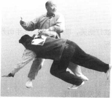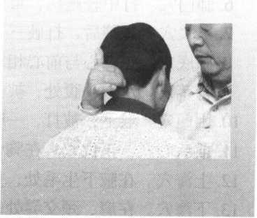 甲方右手中指按住乙方玉关穴 向上勾按,以手指内力点进穴位, 身体右转,胯稍坐,左手顺势向右 侧按乙方肩膀,乙方往甲方右侧跌 出。重点此穴,可致人死亡(图2 )。