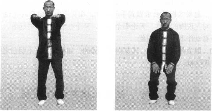 两脚十趾轻轻松抓地;两手由两侧徐徐向上、向前上提,形如抱斗, 手心向下,手与肩平(图3)。