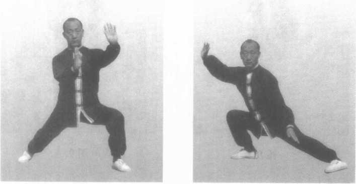对方双拳同时向我正面击来,我以双手粘住对方,向下、向后,引对 方的劲落空后,继续粘住对方,以静待动。
