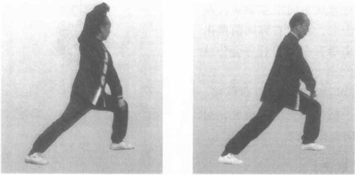 对方以双手撅住我左手腕、肘,我松肘松肩,腰胯下沉,上步管住对 方前脚,将对方向左侧靠出,此是败中求胜法。